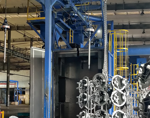 吊钩式抛丸机分为单吊钩和双吊钩吊钩式抛丸机由两个吊钩装载工件交替进入抛丸清理室内利用抛丸器将0.2~0.8的弹丸抛向工件的表面,使得工件的表面达到一定的粗糙度,让工件变得美观,或者改变工件的压应力提高寿命。本机型广泛应用于铸造、建筑、化工、电机、机床等行业的中、小型铸、锻件的表面清理或强化处理。